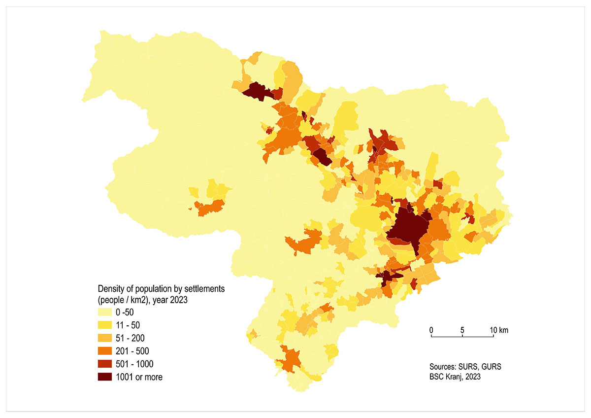 With 2,137 km2, the Gorenjska statistical region is the sixth largest region in Slovenia and represents 10% of Slovenia’s territory. The average population density is 98.4 inhabitants per square kilometre and is distinctly uneven. In January 2023, 210,188 inhabitants lived in the region, their average age was 43.4 years (source: Statistical Office of the Republic of Slovenia). The population continued to grow until 2020, but the last years have been characterized by a decline in the number of inhabitants, both due to negative natural growth and migration (source: Statistical Office of the Republic of Slovenia).