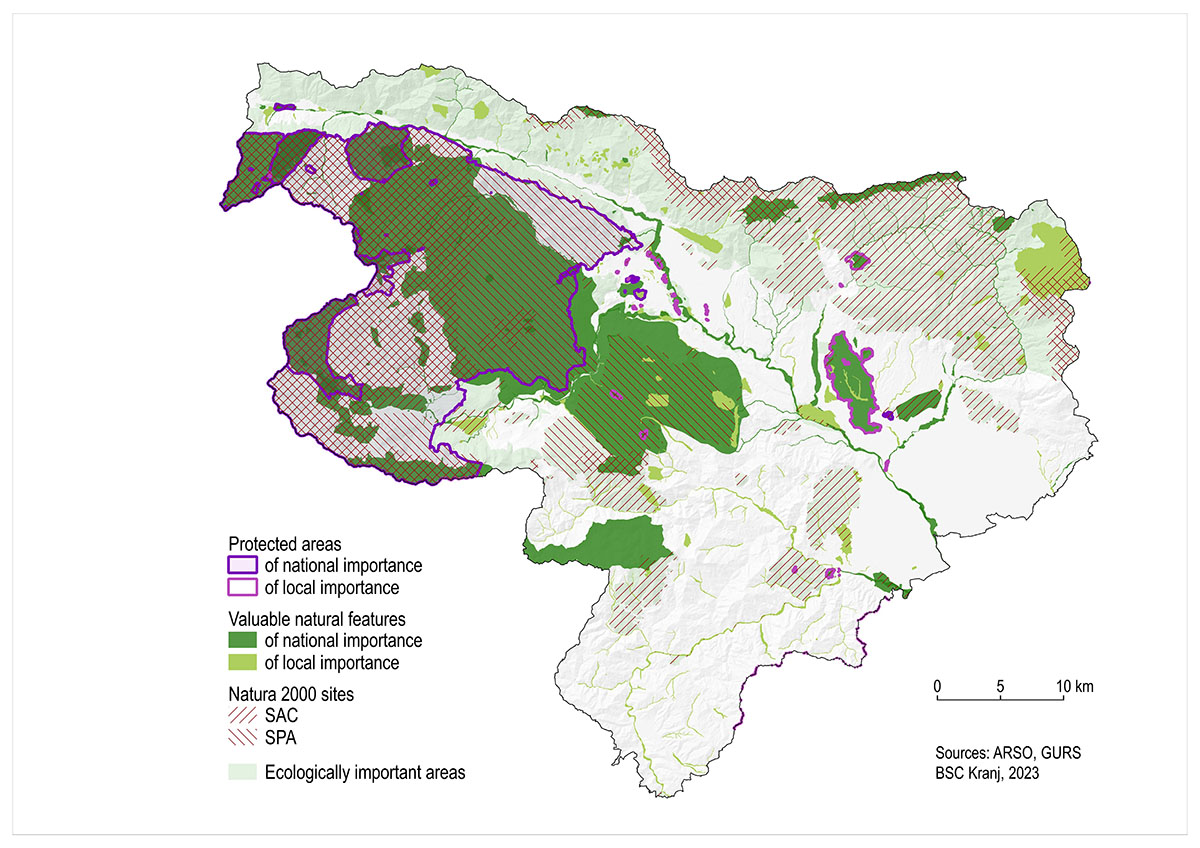 As much as 40% of the region lies above 1,000 m above sea level, 44.3% (946 km2) are NATURA 2000 areas, 24% (508 km2) are protected nature areas, including the Triglav National Park (source: Slovenian Environment Agency).