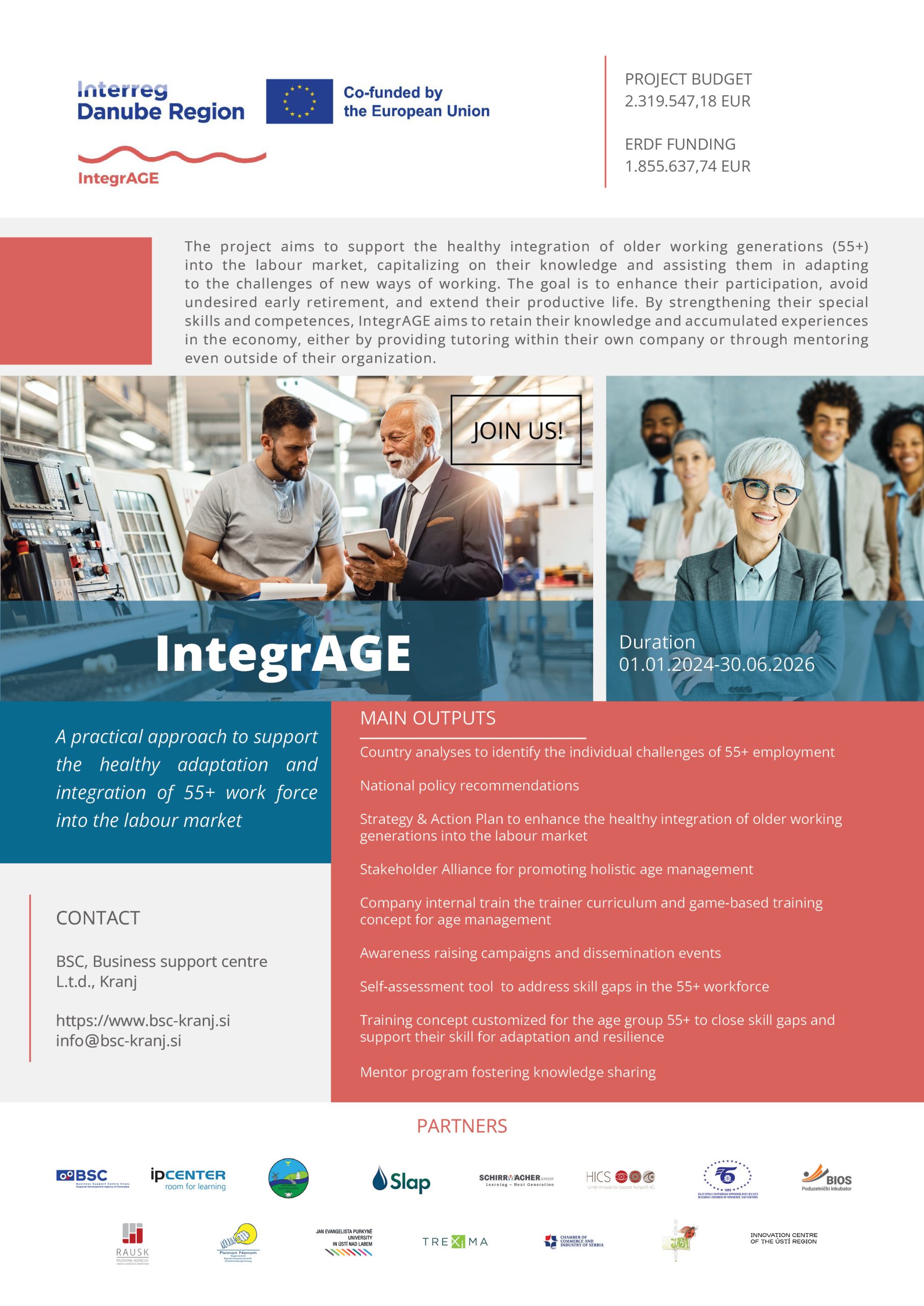 Namen projekta je podpreti zdravo integracijo starejših delovno aktivnih generacij (55+) na trg dela, kapitalizirati njihovo znanje in jim pomagati pri prilagajanju na izzive novih načinov dela. Cilj je povečati njihovo udeležbo, preprečiti neželeno zgodnjo upokojitev in podaljšati njihovo produktivno življenje. S krepitvijo njihovih posebnih znanj in kompetenc želi IntegrAGE ohraniti njihovo znanje in nabrane izkušnje v gospodarstvu, bodisi z zagotavljanjem tutorstva v lastnem podjetju ali z mentorstvom tudi izven svoje organizacije. Poleg tega želi projekt obravnavati vprašanje pomanjkanja kvalificirane delovne sile, zlasti v regijah, kjer je mobilnost delovne sile neuravnotežena, kar vodi v pomanjkanje kvalificiranih strokovnjakov. S pomočjo strokovnega znanja starejših delavcev želi projekt ublažiti to pomanjkanje in prispevati k splošnemu razvoju in rasti teh regij. Pomembno je, da projekt daje velik poudarek spodbujanju starosti prilagojenega in zdravega ravnovesja med poklicnim in zasebnim življenjem. S prepoznavanjem edinstvenih potreb in zahtev starejših delavcev si IntegrAGE prizadeva ustvariti okolje, ki podpira njihovo dobro počutje. To vključuje upoštevanje dejavnikov, kot so prožni delovni dogovori, zagotavljanje sredstev za ohranjanje dobrega fizičnega in duševnega zdravja ter spodbujanje pozitivne in vključujoče delovne kulture.