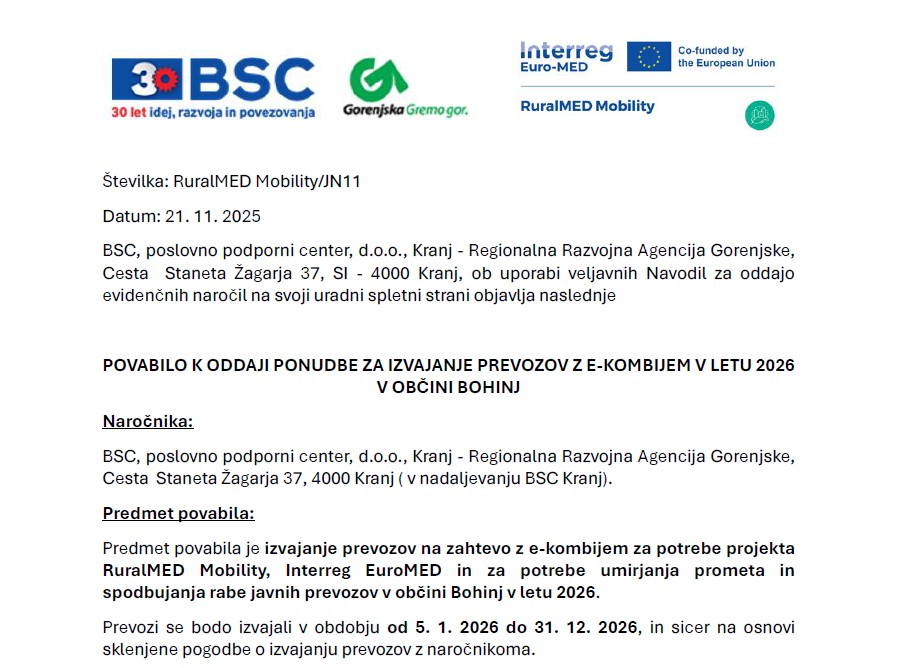 POVABILO K ODDAJI PONUDBE ZA IZVAJANJE PREVOZOV Z E-KOMBIJEM V LETU 2026 V OBČINI BOHINJ