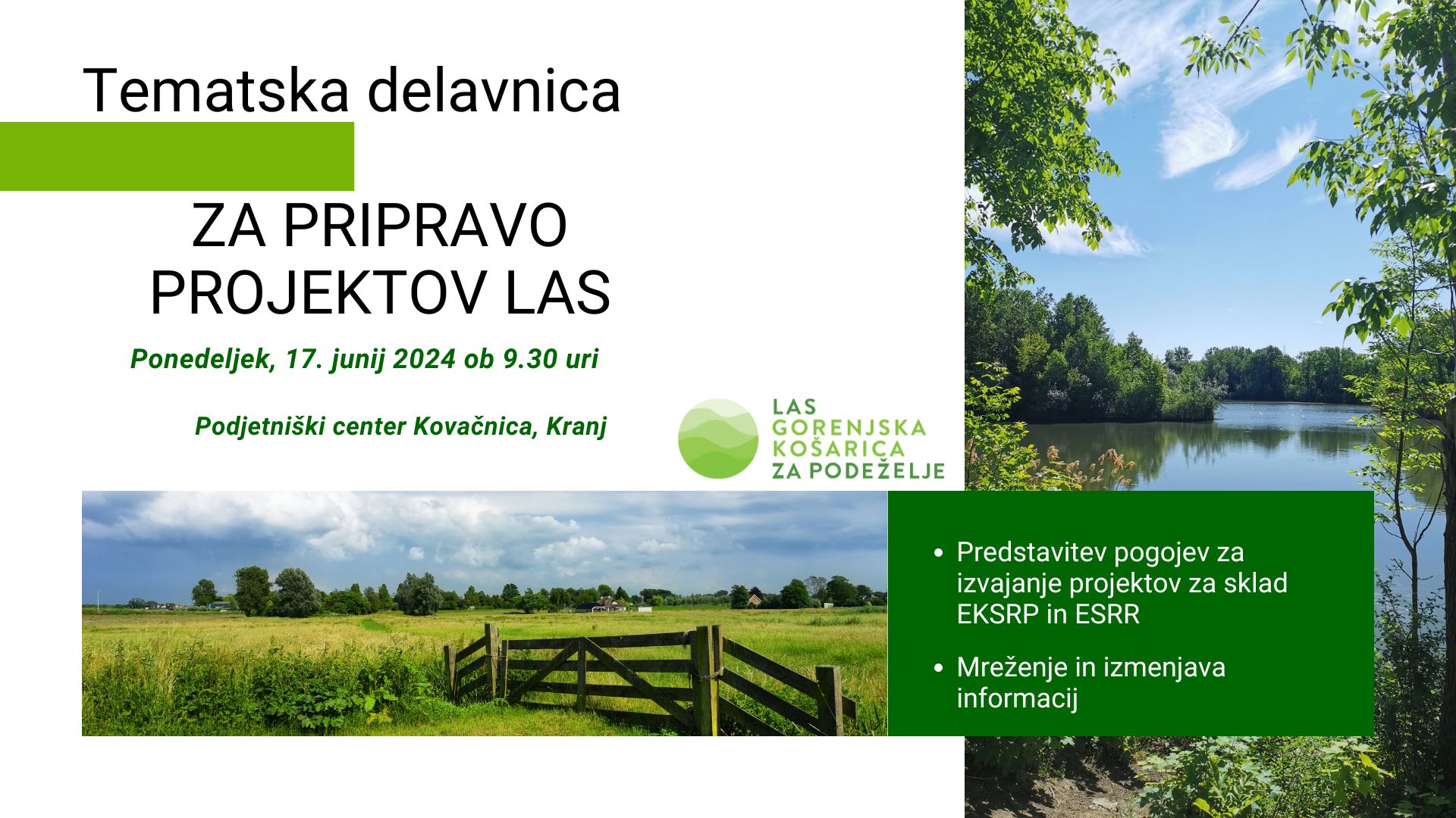 LAS Gorenjska košarica za podeželje vabi vse zainteresirane na Tematsko delavnico za pripravo projektov LAS za kmetijski in regionalni sklad . Delavnica je namenjena vsem, ki želite sodelovati pri pripravi projektov, predstavljeni bodo pogoji za pripravo in izvajanje projektov iz kmetijskega (EKSRP) in regionalnega (ESRR) sklada. V prvi vrsti pa bo delavnica priložnost za mreženje, izmenjavo mnenj ter za nova poznanstva, ki bodo lahko osnova za prihodnja partnerstva pri projektih.