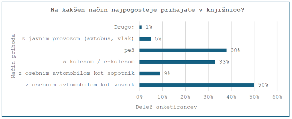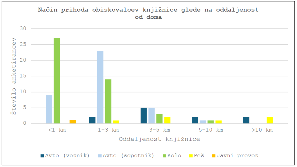 62 % jih živi največ 3 kilometre od knjižnice, kar bi omogočalo prihod peš ali s kolesom – a je še vedno najpogostejši prevoz avtomobil (okoli polovica kot vozniki, 9 % kot sopotniki).