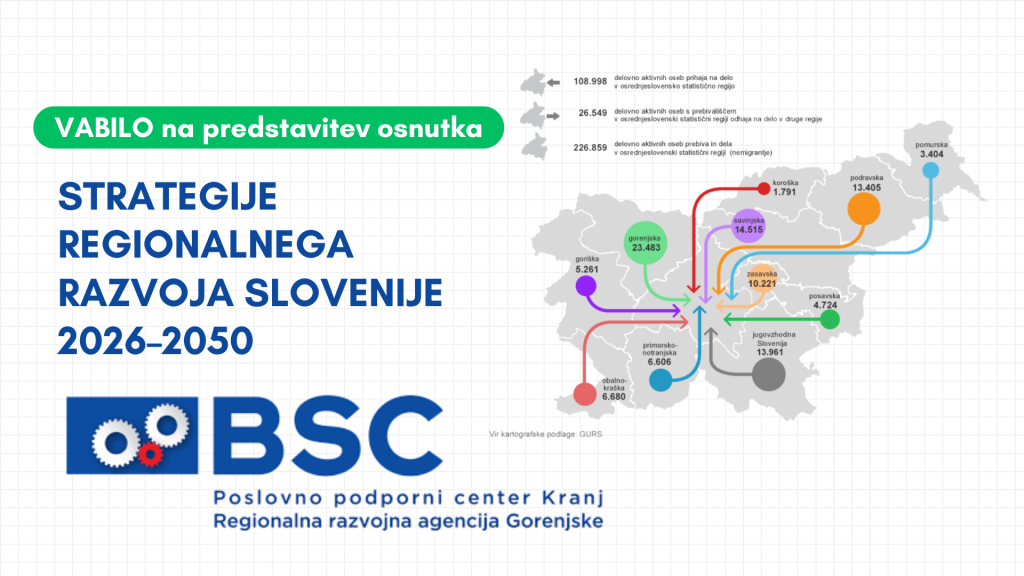 BSC Kranj – Regionalna razvojna agencija Gorenjske vas skupaj z Ministrstvom za kohezijo in regionalni razvoj vabimo na regijsko predstavitev osnutka Strategije regionalnega razvoja Slovenije 2026–2050. Strategija bo predstavljala strateški dokument, ki bo sistemsko in celovito urejal skladen regionalni razvoj, opredelil cilje in usmeritve, oblikoval (sektorsko in prostorsko) usklajene ukrepe regionalne politike in dal regionalnemu razvoju potrebno težo in tudi podlago za učinkovitejše spremljanje in vrednotenje.